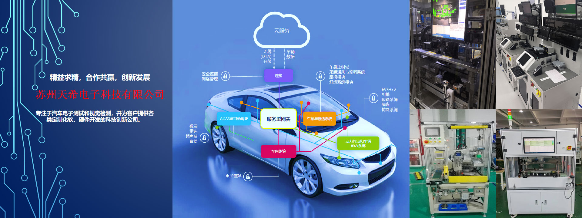 本公司集开发、生产和销售为一体的系统集成商。致力于开发和生产高精密自动化测试设备,工装夹具等相关设备和自动化产线。研发各种标准板卡和仪器,以及为客户定制化开发板卡。公司秉持“精益求精,合作共赢,创新发展”的经营理念,为广大客户提供优质服务和可靠产品。